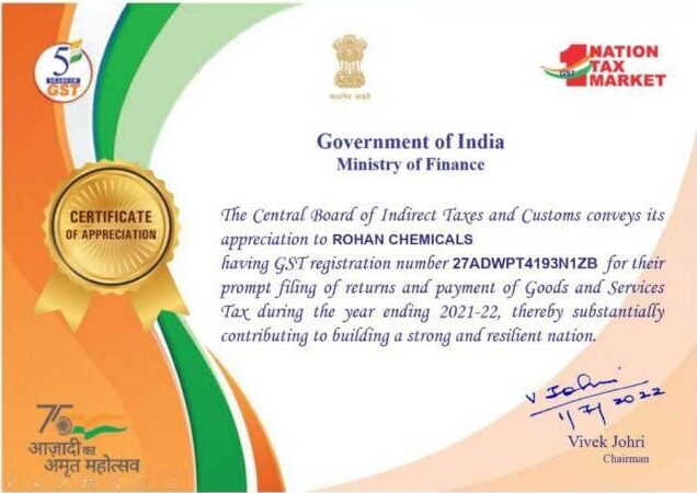 that Rohan Chemicals has been honored with a Certificate of Appreciation under GST by the Government of India. This recognition highlights our unwavering commitment to compliance, ethical business practices, and entrepreneurial excellence. Our journey proves that dedication, market insight, and integrity truly drive lasting success.